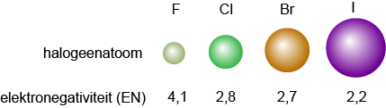 Het kleinste halogeen-atoom is dat van fluor. Fluor heeft een extreem hoge EN-waarde. Reacties met fluor zijn vaak onbeheersbaar, zeg maar: explosief. De EN-waarde van het jood-atoom is het laagst. Iets kleiner dan die van koolstof (2,5).