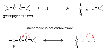Bij een geconjugeerd dieen gebeurt iets bijzonders. In het carbokation kan de dubbele binding verschuiven in de richting van de positieve C: