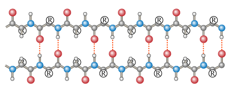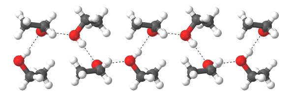 Koolhydraten zoals zuiker, cellulose of zetmeel hebben veel OH-groepen in het molecuul en vormen daardoor ook H-bruggen. Cellulose (materiaal waar papier van gemaakt is) bijvoorbeeld bestaat uit strengen glucose-moleculen die elkaar weer met H-bruggen vasthouden. Papier wordt met heet water een papje. Je maakt dan de H-bruggen los. (Lees meer in hoofdstuk 12.) In de tekening zijn de H-bruggen blauw: