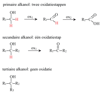 Speciale aandacht hier voor de partiële oxidatie. Een alkanol is met milde oxidatiemiddelen te oxideren zolang als er nog waterstofatomen aan het koolstofatoom zitten. Het koolstofatoom van de OH-groep welteverstaan.