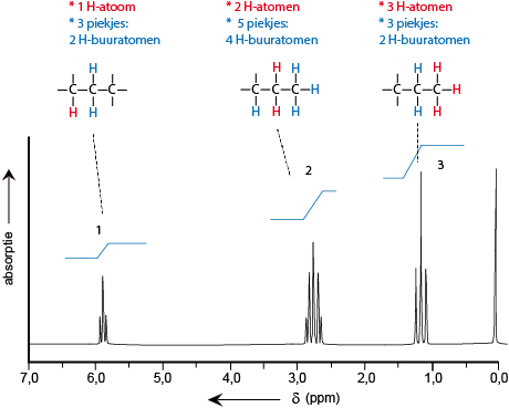 2 de plaats op de X-as (chemical shift) geeft het type H-atoom, dat wil zeggen: waar in het molecuul dit H-atoom zit,