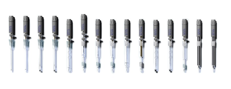 Ook al is de sensor die in de oplossing steekt vaak maar één staafje..... Er zitten dan toch twee elektroden in. Een dergelijke sensor met daarin twee elektronen wordt ook weer "elektrode" genoemd. Voor veel verschillende toepassingen zijn er ook veel verschillende elektroden. Hier een setje elektroden van de firma Mettler: