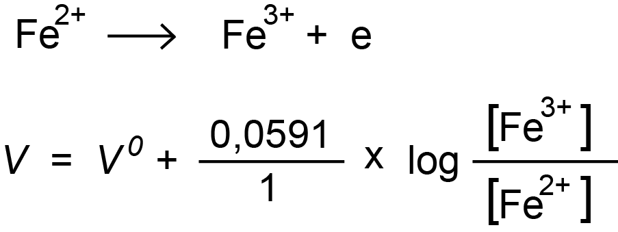 De elektrodepotentiaal volgt de wet van Nernst. Titreren wij bijvoorbeeld ijzer(II)-ionen tot ijzer(III)-ionen, dan wordt het ijzer geoxideerd. In de formule van Nerst staan - in de breuk na het log-teken - de concentraties van de "oxidatorkant" boven de streep. Deze titratie voer je uit met een oxidator. Tijdens de titratie neemt [Fe2+] af. Terwijl [Fe3+] groter wordt. De breuk als geheel wordt dus groter: de spanning V stijgt. De titratiecurve is stijgend. Dit is algemeen zo: