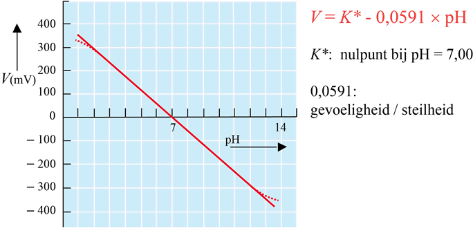 Bij heel lage pH raakt het glasmembraan volledig bezet met H3O+. Hierdoor is het pH-verloop bij nog lagere pH niet meer lineair. De pH die je afleest is dan iets hoger dan in werkelijkheid. Dit heet de "zuurfout".