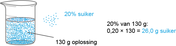 De oplossing bevat 20% suiker. 20% van 130 g is 0,20 x 130 = 26,0 g suiker.