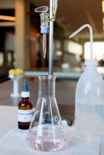 Tijdens een "acidimetrische" titratie verandert de pH. Het theoretisch titratie-eindpunt is in de pH-sprong. Daar waar de pH het sterkst verandert. Om het volume te vinden waarbij dat het geval is, gebruiken we een indicator of pH-meter.