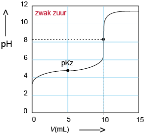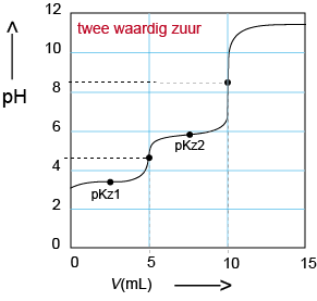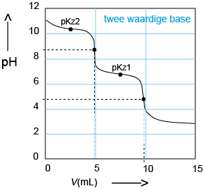 F Titratie van een tweewaardige zwakke base: Zoutzuur in de buret, base in de titratiekolf. Er zij twee pH-sprongen. Voor elke reactiestap één. Tweemaal is er nu een situatie met evenveel zwakke base als zwak zuur. De pH is dan steeds weer gelijk aan de pKz van het zwakke zuur. |