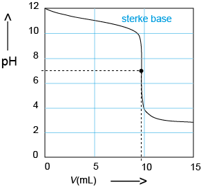 D Titratie van een sterke base: Zoutzuur in de buret, sterke base in de titratiekolf. De pH daalt sterk rond pH = 7. |