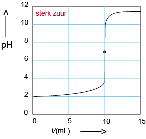 A Titratie van een sterk zuur: Natronloog in de buret, sterk zuur in de titratiekolf. De pH stijgt sterk rond pH = 7. |