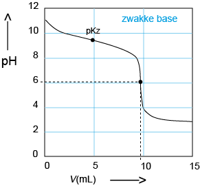 E Titratie van een zwakke base: Zoutzuur in de buret, zwakke base in de titratiekolf. De pH daalt sterk rond pH = 7. Halverwege is er weer een situatie waarbij er evenveel zwakke base als zwak zuur aanwezig is. De pH is dan gelijk aan de pKz van het zwakke zuur. |