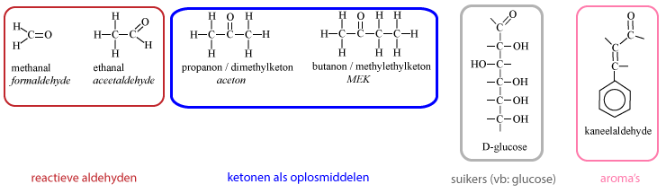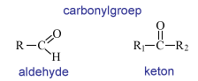 Aldehyden en ketonen, je kunt ook zeggen "carbonyl-verbindingen". Want een dubbelgebonden zuurstofatoom op een koolstofatoom is een carbonylgroep. Zit de carbonyl aan het einde van de keten, dan is het een aldehyde. Op het koolstof zit dan nog een waterstofatoom. De groep is nog oxideerbaar. Zit de carbonyl in de keten, dus op een secundaire C, dan is het een keton.
