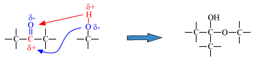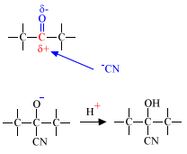 De meeste reacties van carbonylverbindingen zijn addities. Er is immers een dubbele binding! Het is nu niet een elektrofiele additie zoals bij een alkeen, maar een nucleofiele additie. De reactie verloopt doordat een negatief (nucleofiel) deeltje aanvalt op het positieve koolstofatoom.